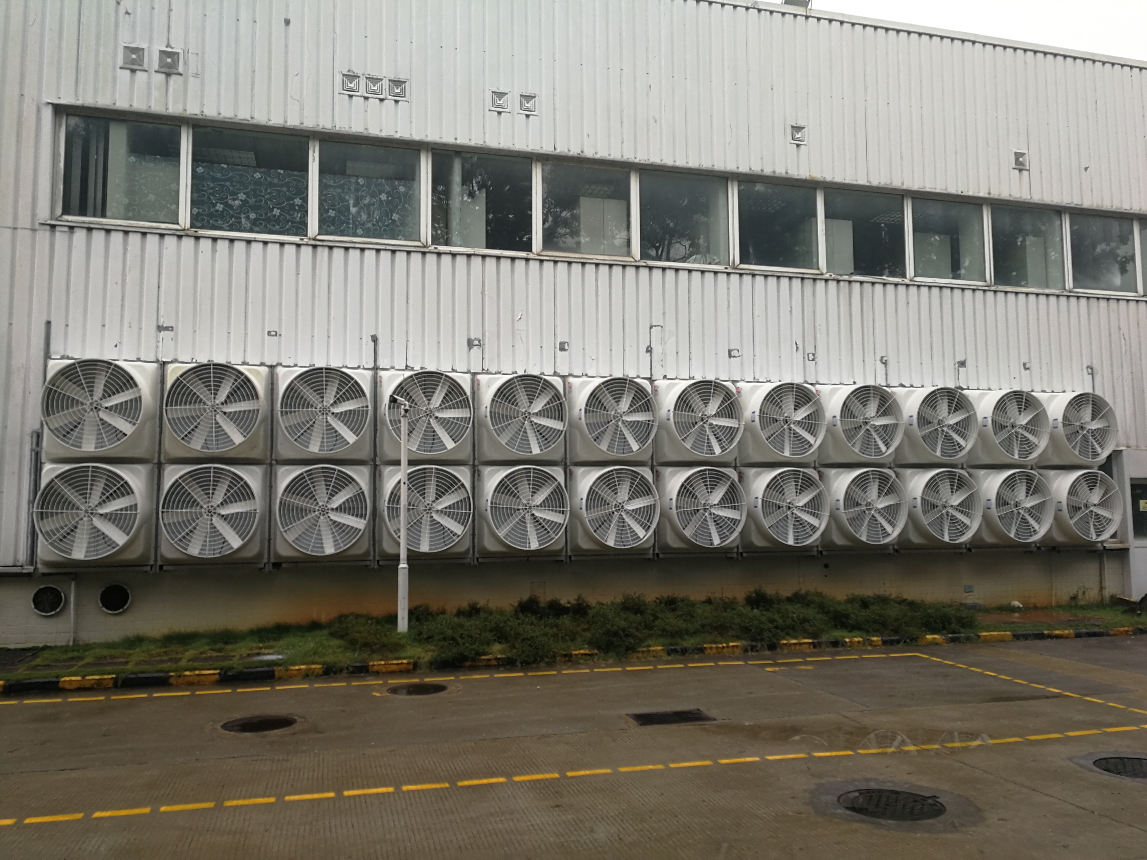 皮具皮革廠車間通風(fēng)散熱系統(tǒng)騰煌工業(yè)風(fēng)扇轉(zhuǎn)動所產(chǎn)生的氣流由上而下形成錐形往地面推動,到地面后沿水平方向流動,遇到側(cè)面阻隔或鄰近風(fēng)扇的水平氣流向上推動到屋面,從而全方位、多角度地強(qiáng)化空氣循環(huán)流通;流動的空氣可以迅速通過門窗與室外新風(fēng)進(jìn)行交換,減少車間內(nèi)渾濁氣體的滯留,它所持續(xù)的輕柔微風(fēng)能加快人體表面汗液的蒸發(fā)速度從而產(chǎn)生涼爽的降溫效果,很大程度上解決了空調(diào)降溫與高能耗的沖突,在無需安裝空調(diào)系統(tǒng)情況下達(dá)到小投資、大回報(bào)的效果。廠房車間降溫通風(fēng)之負(fù)壓風(fēng)機(jī),抽排高溫悶熱空氣降溫。